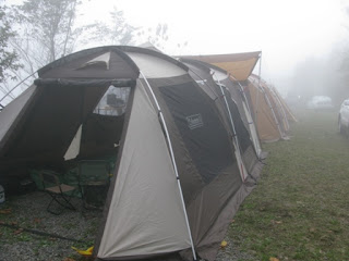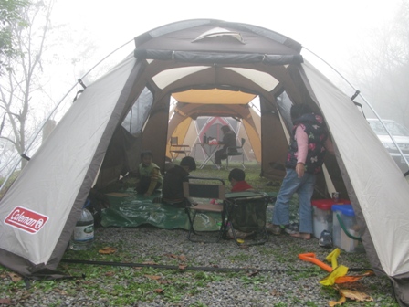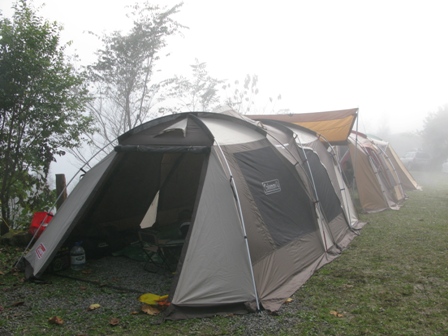 下完裝備後,開始討論、規劃帳篷的搭設位置,最後是以門當戶對的方式,讓 Snow Peak 與 Coleman 兩頂帳連接在一起,充當這次露營的客廳與廚房。有了前次溫家茶園的經驗後,這次搭設 Coleman WeatherMaster 也順手許多,日後的露營還要靠它提供我們遮風避雨、阻隔烈日、一夜好覺的地方。