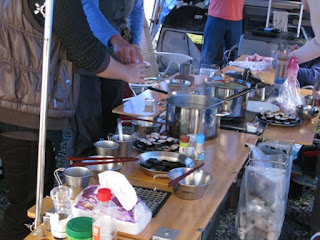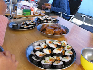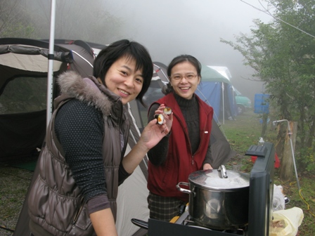 由於已近中午,就先弄點可以快些上桌的食材,最後上桌的菜色有四神湯、壽司、滷海帶、滷豆干,還有麥坤家族的水餃,由於尚未搭帳,所以借用自由家族的客廳帳一同用餐,順道拜碼頭、寒暄一番。