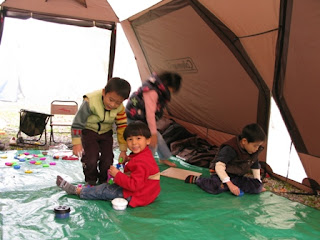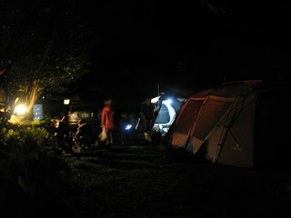 小朋友們用餐完畢後便不見蹤影,僅能偶而聽到他們的笑聲與么喝聲,大人們聊天聊到一半才意會到:小孩ㄋ..........天啊 !! 外面一片漆黑,小孩不見了又沒大人陪,若是在家裡一定慌了手腳,在營地裡就無須太擔心了。不過,夜裡沒大人陪的小朋友們還是早點回來比較好,所以安排了場蚊子電影院(片名:功夫熊貓二),讓小孩們安安靜靜的坐在帳篷裡。