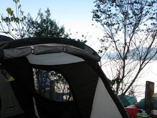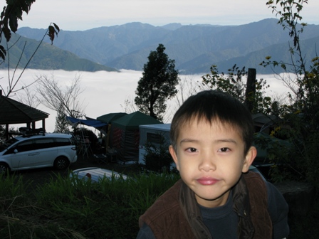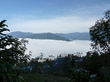 約莫中午12點時,終於到達營地,但竟傳來嘆息聲,嗡嗡嗡姑娘說『就在十分鐘前,雲海才剛剛散去,只差一點就可以看到了,真可惜!!』,原來我們剛剛置身的山嵐,就是其他人眼中的雲海,也難怪嗡姑會如此嘆息,這已經是她們家族第三次來到鳥嘴山,之前都無緣欣賞到雲海景觀。