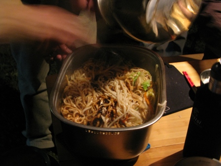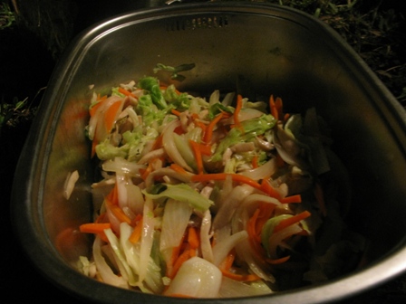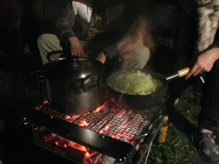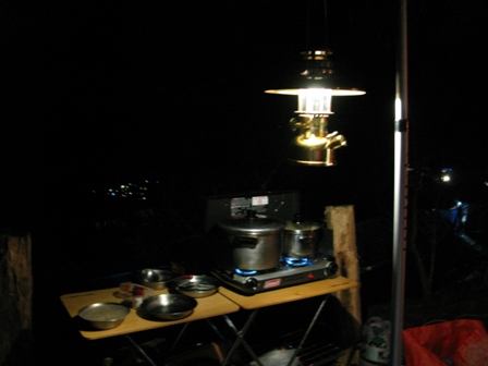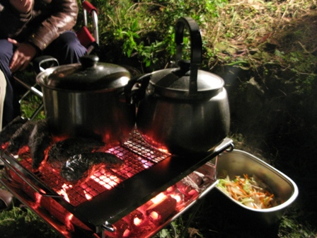 夜幕低垂,大伙忙起炊事準備晚餐,除了雙口爐外也準備了焚火台應付炊事,沒想到瓦斯不夠,原來是上次溫家茶園使用後,不知到底剩多少,所以二桶都沒再送去灌,而且這次鳥嘴山露營,嗡姑想簡裝一點點,就少帶一組雙口爐和廚房流理台,但沒想到大家都帶火鍋料來,煮很久水都不滾,還好還有焚火台在,最後炒麵、火鍋、烤魚、烤地瓜、熱開水都用焚火台解決。