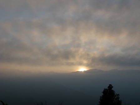 清晨六點半起床後,在營地四處晃晃,對面山頭似乎有光芒露出,我想不久後應該有機會可以看到日出,時間一分一秒的過去,山頭上的光芒也愈來愈明亮,大約七點左右,太陽已旭日東昇照耀大地,不過約五分鐘後,太陽又竄入雲層中,蒙上一層薄紗的太陽也挺美的,也恰好巧遇這雲層,才能清楚拍攝到剛升起的太陽。