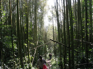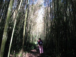 爬完一段竹林斜坡,走沒幾步平緩的路,又是另一段竹林斜坡,就這樣不斷往上爬後,終於到達稜線,走在稜線上山景很壯麗,不過沒多的時間駐足欣賞,仍是一步一步往前走,翰 此時一邊走一邊哼著歌,似乎很享受這段旅程,好不容易走到下切處,嗡姑在這裡等著我們,還好有嗡姑在,要不然接下來的下切路段,一次帶兩個小朋友走,我想回到營地後,應該會是下午兩點吧。