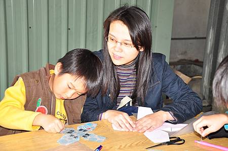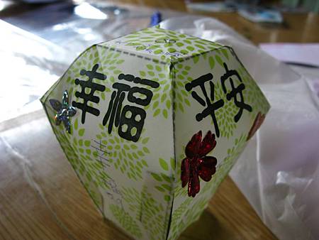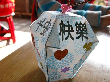 參與的家庭,經由志工姊姊的帶領,手工製作小天燈,從剪紙、摺紙、黏貼飾品、固定吊帶,逐步完成祈福小天燈。