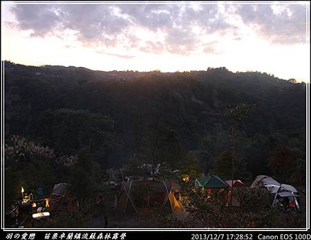 天空彷彿抹上淡妝,淡淡粉紅塗滿了天際,與營地燈光交織成一幅美景