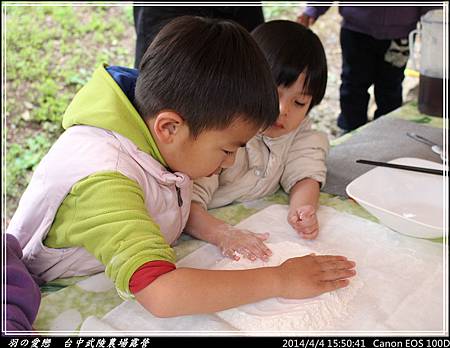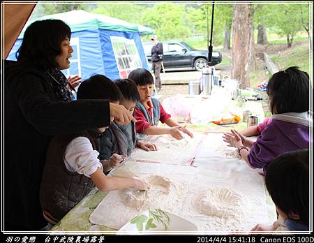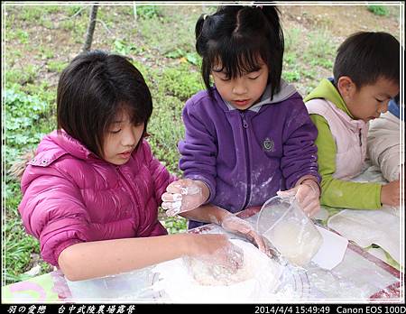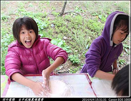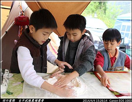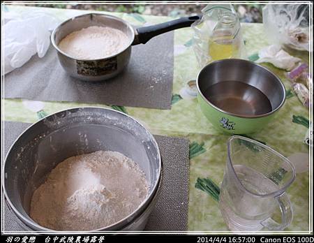 先將麵粉圍成一個圈圈,這個小鬼最拿手了,每次露營時都想搭水壩,這次不用挖土,換成麵粉水壩 ^^