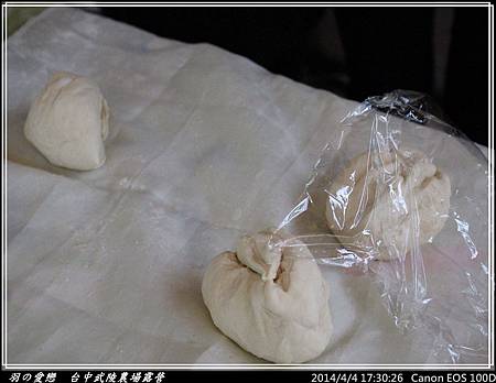 將麵糰切割成數個小麵團,再以包鮮膜覆蓋之。接下來,就等它醒(發酵完成) ~~~ 六小時候它就會醒囉 ^