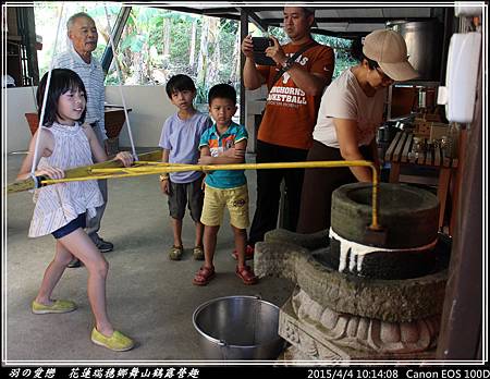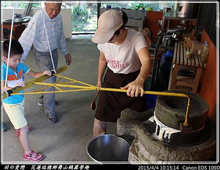 小孩組最後一批是 翔與翰,順勢推動石磨,老師在一旁適時加入黃豆,讓豆漿可以源源不絕自石磨流出