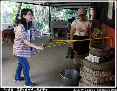 經過老師的詳盡解說後,開始運動時間,大夥輪流上陣,搖臀擺股轉動石磨,讓豆漿從石磨汩汩流出