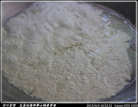 加入泥火山水當作鹽滷的豆漿,慢慢在水面上,浮現一道道泡沫 ,泡沫愈聚愈多、愈聚愈厚