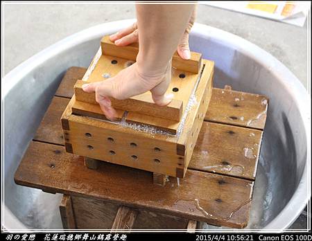 靜待凝結後,準備起鍋,將豆泡置入木板模中
