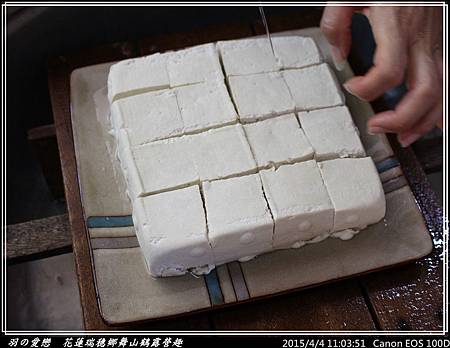 用刀切割成一塊塊的豆腐,讓大夥可以品嘗自己動手做的豆腐