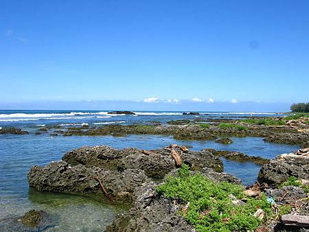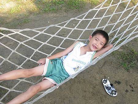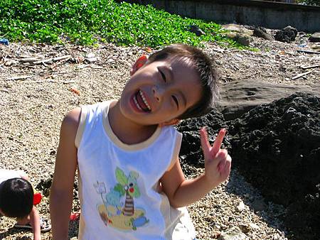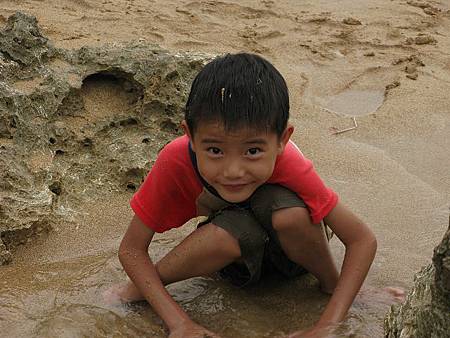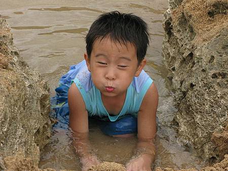 又再一次辛苦麻麻,在岸上幫我們顧隨身物品,拔拔與小朋友們則衝到礁岩間尋寶,在潮間帶內熱帶魚、螃蟹、寄居蟹、海鰻(還是海蛇@@" 傻傻搞不清楚)在礁岩間悠游,拿起網子撈阿撈的,竟然也抓到一堆魚蟹,翔翰 可樂了,更加起勁、卯起來繼續抓。翰 抓累了,索性玩起水來,躺在在海水內翻來覆去,自得其樂。