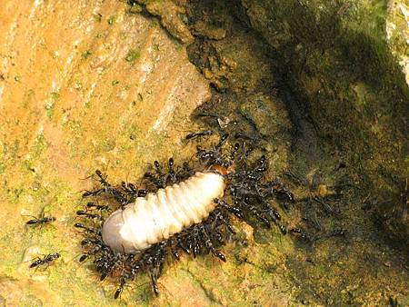 在觀海台下,麻麻發現螞蟻大軍正在搬巨大的食物,翔翰 慢慢觀察螞蟻的行動路線。