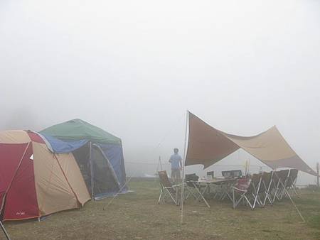 不久,天幕的那個方向,飄來一陣陣令人垂涎三尺的味道,誘惑大夥往天幕移動。美味的午餐,搭配令人心曠神怡的山景,又飄來陣陣雲霧,古書才有的詩情畫意情景,此刻卻如夢似幻般發生在我們的周遭,真是人生一大享受。享用午餐之際,心爺爺吆喝大夥喝酒,淺嚐美酒,濃濃的人情味也發酵在朋友們的談笑之間。