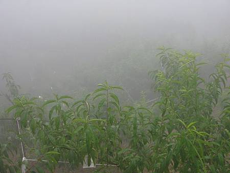 此時遠邊的山谷傳來數道悶雷聲,霧氣也更濃了,原本就濕氣很重的空氣,此刻也飄下雨滴,雖然早已知道氣象預報本日下午高達 90% 會出現午後雷陣雨,但是仍難掩失望,畢竟當下正要步行前往雅渡,下起雨來會十分不便。