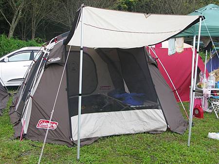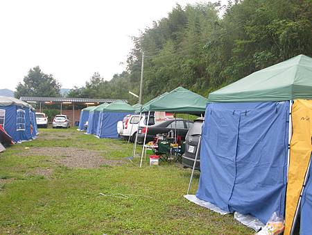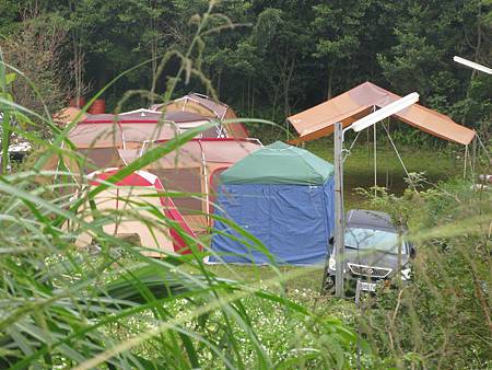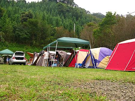 由於比較晚到而且朋友家族較多,無法於 View 較好、面對山景的地方紮營,退而求其次,七組營帳加上天幕帳,我們把上層營區的右側全包了,加上停放的車輛,巧妙的區隔出我們的勢力範圍 @@" ~~~ 喔~不 ~~~ 是活動範圍。