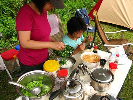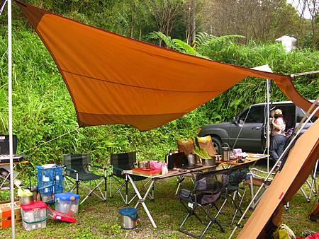 時間已近中午,大夥兵分兩路,裝備組先以兩頂 22 秒帳,搭成臨時的廚房與餐廳,讓炊事組可以趕快張羅午餐,餵飽一張張嗷嗷待哺的嘴 ^ ^"