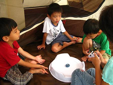 這次 翔翰 準備的休閒玩意兒都派上用場,戰鬥陀螺組、羽毛球組、小足球都拿出來與大家分享著玩,最近這幾次露營玩的水壩遊戲也該換換口味了。
