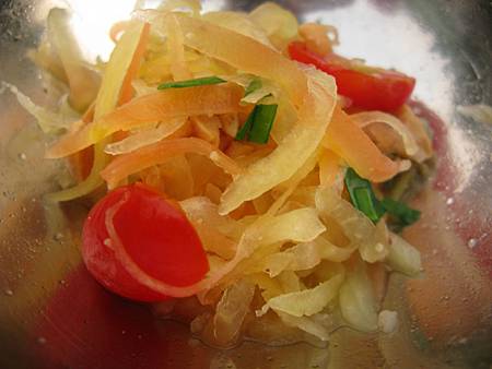 除了粄條外,扯鈴還準備了醃製青木瓜,木瓜還是自己種的喔