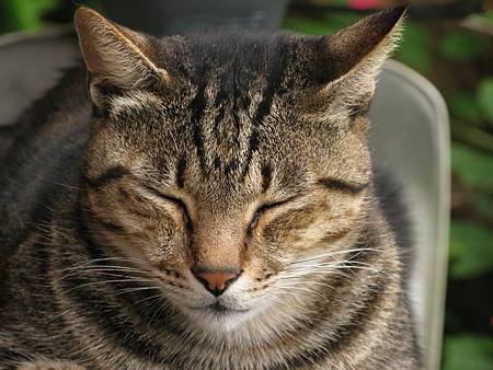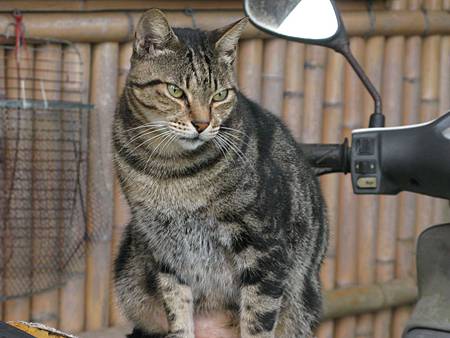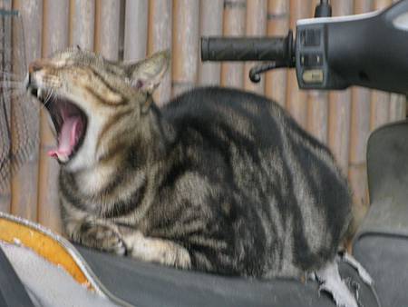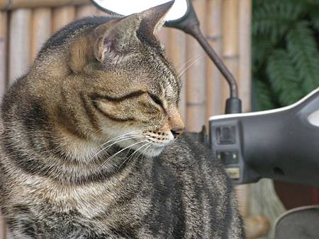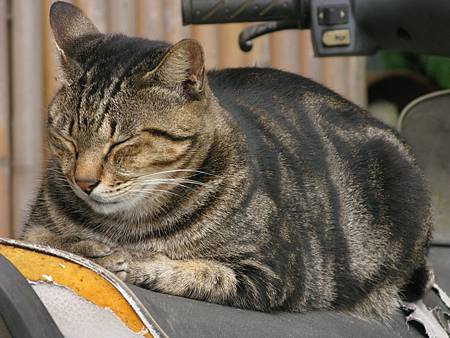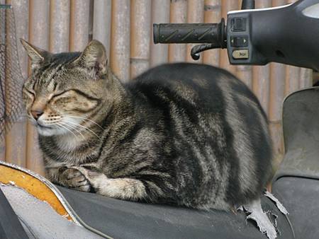 走到營地主人的竹屋前,恰巧有隻『貓』趴在機車坐墊上,感覺很特別,於是拿起相機偷拍牠睡覺的模樣。