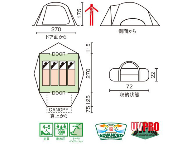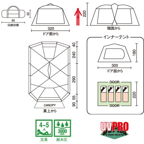 - 使用時:約 300×220×180(h)cm(インナーテント)